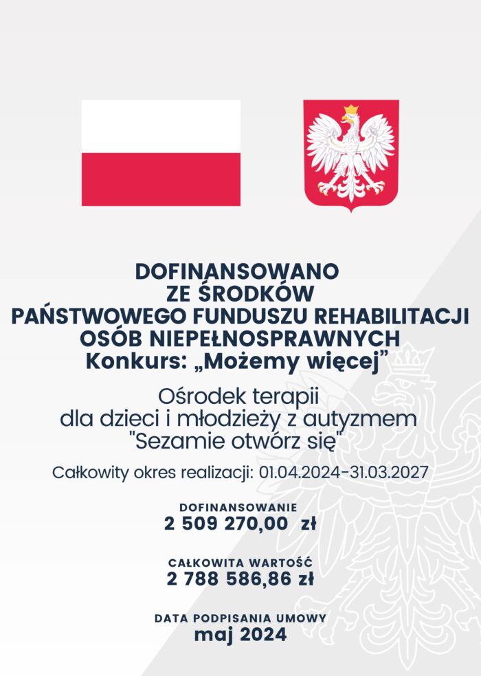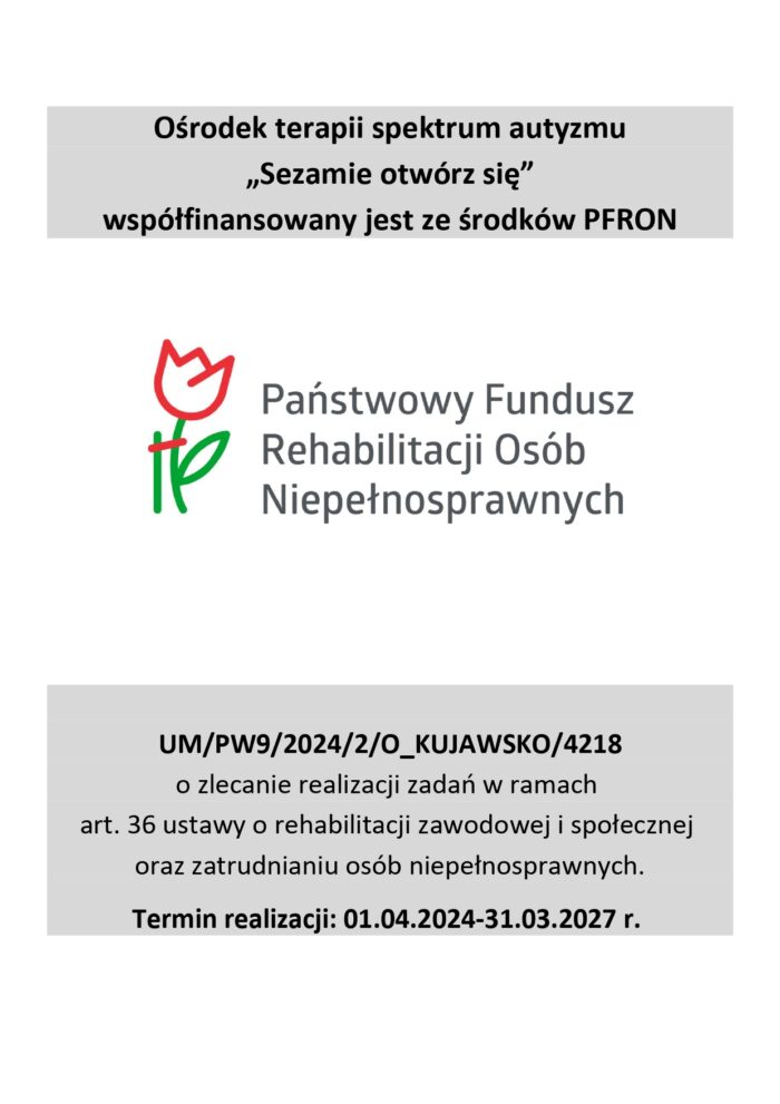 Ośrodek terapii spektrum autyzmu „Sezamie otwórz się” współfinansowany jest ze środków PFRON umowa UM/PW9/2024/2/O_KUJAWSKO/4218 o zlecanie realizacji zadań w ramach art.36 ustawy o rehabilitacji zawodowej i społecznej oraz zatrudnianiu osób niepełnosprawnych. Termin realizacji: 01.04.2024 – 31.03.2027. Beneficjenci: dzieci i młodzież z diagnozą spektrum autyzmu i orzeczeniem o niepełnosprawności/o stopniu niepełnosprawności. Prowadzimy: terapię indywidualną 5x w tygodniu oraz zajęcia profilowane i grupowe zajęcia integracyjne.
